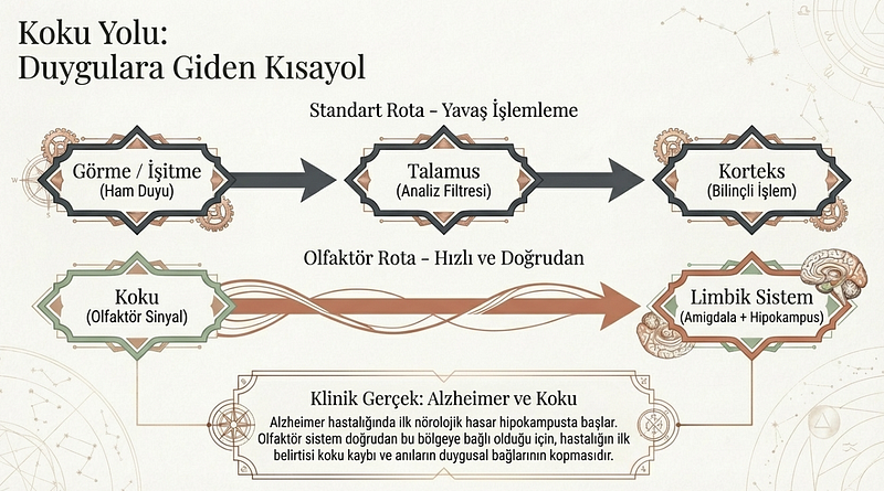 Görme, işitme, dokunma gibi duyular beyne ulaşırken önce çeşitli istasyonlardan geçer; özellikle talamus üzerinden filtrelenir, ayrıştırılır ve ardından kortekse iletilir. Ancak koku bu klasik yolu izlemez. Olfaktör sistem, limbik yapılara neredeyse doğrudan bağlanır. Bu da kokunun hippocampus ve amigdala ile çok daha hızlı ve aracısız bir ilişki kurmasını sağlar.