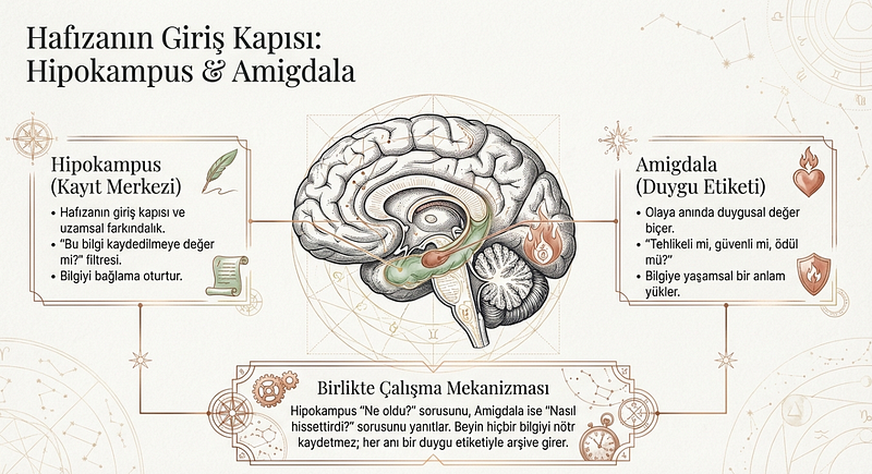 Bu ayrım çok önemlidir çünkü Hippocampus tam olarak bu iki katman arasında çalışır. Duyular Hippocampusa ulaşır, burada bağlama oturtulur, geçmiş deneyimlerle ilişkilendirilir. Aynı anda amigdala bu deneyime bir duygu yükler. Ve bu iki süreç birlikte çalıştığında, bilgi kalıcı hafızaya dönüşmeye aday hale gelir.